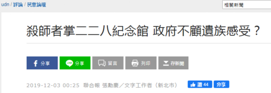 台湾《联合报》也刊发评论称,这个在课堂上当众砍杀老师的人,竟成了台当局任命的“二二八纪念馆馆长”兼“二二八基金会执行长”,“无疑对命丧二二八的同胞和遗族,有强大精神和心理上的冲击”,“暴行加害者何以摇身一变,成了无辜且等待公义到来者?”