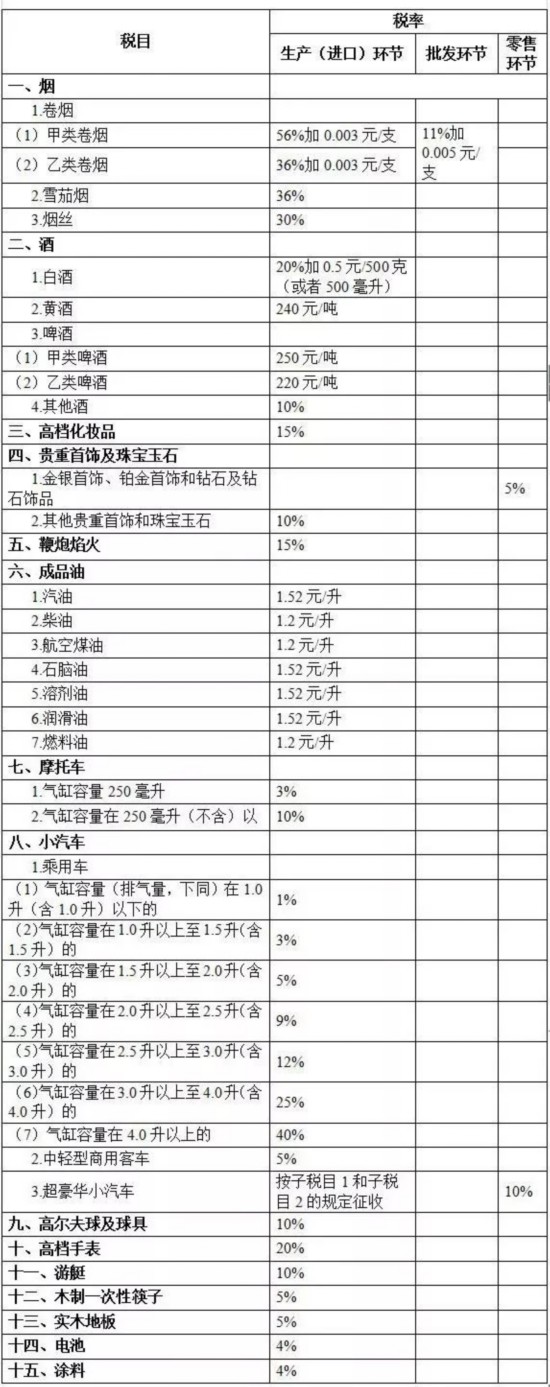 需要指出的是,按照此前公布的《财政部 国家税务总局关于调整金银首饰消费税纳税环节有关问题的通知》以及《财政部 国家税务总局关于对超豪华小汽车加征消费税有关事项的通知》,“金银首饰、铂金首饰和钻石及钻石饰品”和“超豪华小汽车”这两类商品在零售环节征收。