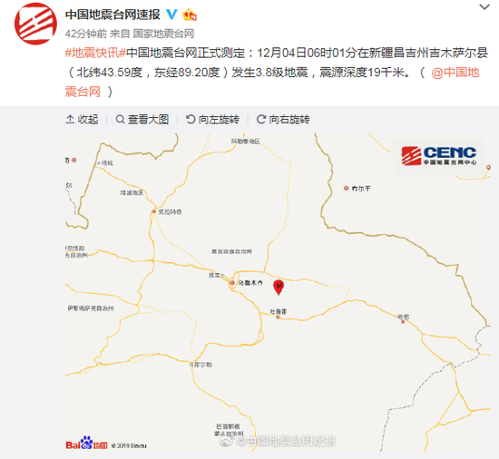 中国地震台网正式测定:12月04日06时01分在新疆昌吉州吉木萨尔县(北纬43.59度,东经89.20度)发生3.8级地震,震源深度19千米。