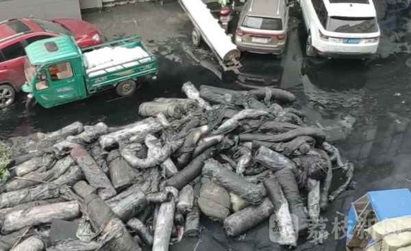 距离事故发生地200米,油状的污水从罐体倒塌处一直延伸到这里,数十名环卫工人在路边清理墨色的垃圾,而一趟趟运送垃圾的卡车在路中间留下黑色的车辙。