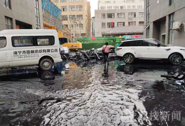 沿着环卫工人指出的道路,记者继续向里面走,距离事故地100多米时,地面已被油状污水完全覆盖,很多地方仍能没过脚面,从路面一直延伸进入车间。确实有多辆挖掘机在作业,有的在路上,有的则已经开进了车间里。