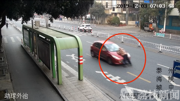 12月3日上午7点,泰州市海陵区一轿车顶着一位老人开出近一公里。老人趴在红色轿车引擎盖上,脚不时与地面发生碰擦,情况十分危险。