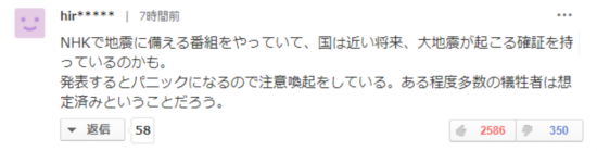 这位网友猜测称,“NHK做地震预防节目,国家是不是确信不远的将来会发生大地震。真的发表的话会引发恐慌,是不是已经明确会造成多少伤亡了”。