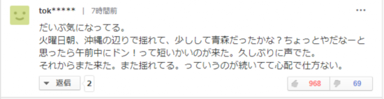 这位网友则表示,“越来越在意了。这周二早上,冲绳附近地震了,之后没多久青森好像又震了。刚觉得好烦的时候,上午突然(东京)也开始摇。久违的吓得我叫了出来,之后又摇了好几次,好怕会继续下去”。