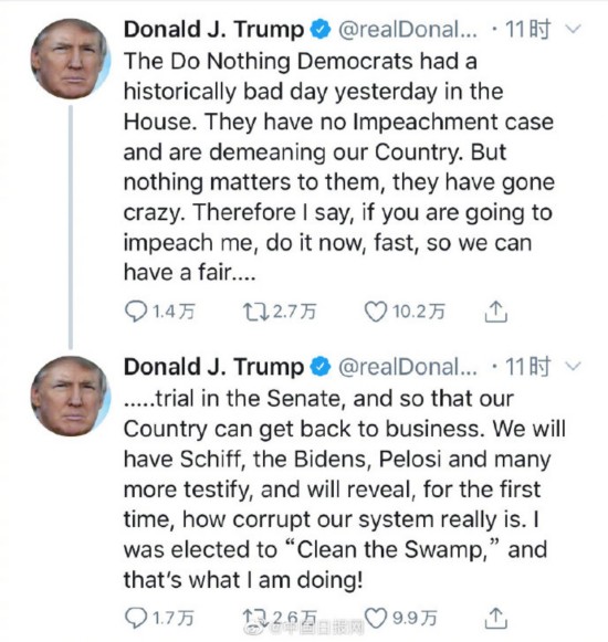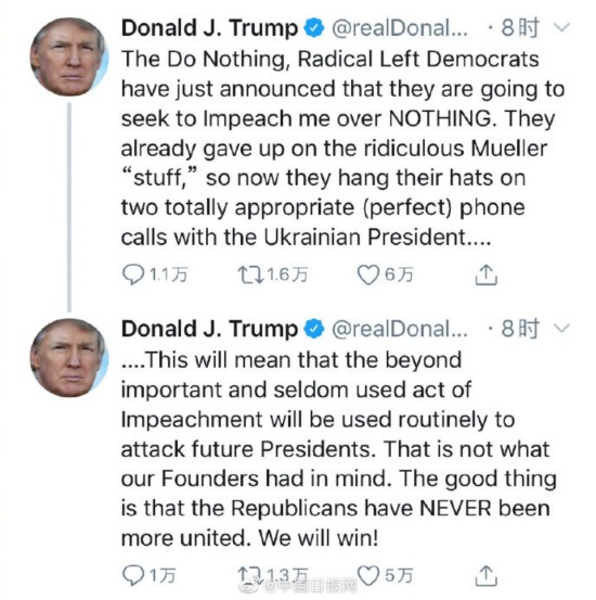 据美国国会山网站5日报道,美国众议院当天宣布针对总统特朗普的弹劾条款。国会众议院议长佩洛西更是表示,特朗普在处理乌克兰事务中以美国国家安全为代价,滥用权力以获得个人政治利益,行为“触犯(美国)宪法的核心”。不过,白宫和特朗普本人都对应对弹劾显得信心十足。特朗普连发数条推文回应此事。他表示,无所作为的民主党人正在贬低我们的国家,“对他们来说什么都不重要,他们已经疯了。所以,如果你要弹劾我,现在就弹劾吧,快点儿吧”。他还说:“共和党人从未像现在这样团结,我们会赢的!”