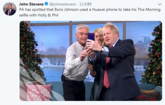 《每日邮报》副政治编辑约翰·史蒂文斯12月5日在推特上发布了约翰逊用华为手机自拍的照片。