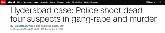 【环球网报道 记者 侯佳欣】“强奸”、“谋杀”、“尸体被焚烧”……近日,印度27岁女子被奸杀烧尸案在该国引起轩然大波。这一谋杀案引起印度民众的愤怒,社会各界纷纷要求警方彻查。不久,4名涉案嫌疑人被警方拘留。据美国有线电视新闻网(CNN)最新消息,当地时间12月6日,一名印度官员证实,4人因在拘留期间抢夺警方配枪而引发枪战,最终被警方击毙。