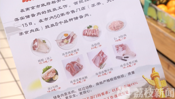 今天上午十点,记者来到南京玄武区一家苏果超市,看到猪肉柜台专门开辟了一个地方卖政府储备肉。只剩下了少量的肉糜和前腿骨。从宣传手册来看,这次一共投放8个品种的肉,其中有6个品种的价格在每斤20元以下。最便宜的冻带肉前腿骨每斤13.6元,最贵的是冻肋条,每斤24元。