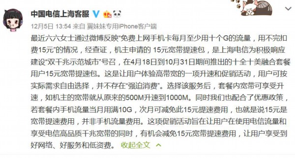 12月5日下午,中国电信上海客服在其官微再次就六六投诉强制扣费事件进行解释,中国电信上海客服表示,15元是宽带提速费用,并非手机流量费用。这项促销活动旨在让用户在使用电信流量和享受电信高品质千兆宽带的同时,有机会减免15元宽带提速费用,让用户享受到好网络、好服务和低资费。