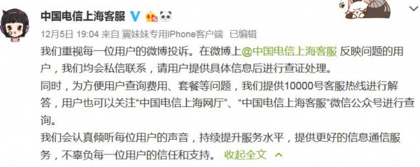 12月5日晚,中国电信上海客服官方强调,重视每一位用户的微博投诉。在微博上@中国电信上海客服反映问题的用户,均会私信联系,请用户提供具体信息后进行查证处理。