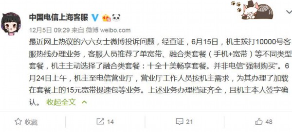 12月5日上午,中国电信上海客服发文称,最近网上热议的六六女士微博投诉问题,经查证,6月15日,机主拨打10000号客服热线办理业务,客服人员推荐了单宽带、融合类套餐(手机+宽带)等不同类型套餐,机主主动选择了融合类套餐:十全十美畅享套餐。并非电信“强制购买”。6月24日上午,机主至电信营业厅,营业厅工作人员按机主需求,为其办理了加载在套餐上的15元宽带提速包等业务。上述业务办理档证齐全,且机主本人签字确认。