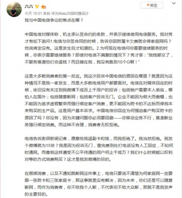 六六谈到,电信告诉澎湃新闻记者,愿意给自己退副卡和钱,自己拒绝了:“我发个微博就为15块?我是因为投诉无门,缴完费到处打电话没有人工回应,不知何时通网。而像我这样遭受不公平待遇的用户何止千或万?我们什么时候能以权利对等的方式消费购买?这才是我发微博的目的。”