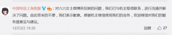 来源:“中国电信上海客服”评论12月3日15:30,微博认证为“中国电信上海客服”账号在“六六”微博下方评论称:“对六六女士微博所反映的问题,我们已与机主取得联系,进行沟通并解决了问题。由此带来的不便,我们表示歉意。感谢机主继续使用我们的业务,欢迎继续对我们的服务提意见与建议。”