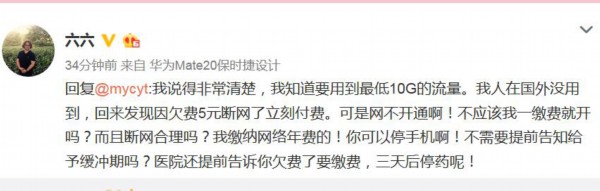 12月6日20点,六六再次再发声并与网友互动:“这不是我一个人的问题,是很多人面对的问题。可以说断网就断网吗?有提示告知义务吗?另外我作为客户,每次欠费都往家里电话号打钱,这次才知道,电话号和上网卡不互通,不是说家里电话卡里有钱网卡就通畅。在我这一个系统,到你那俩系统,都在一个户口下,我怎么知道呢?