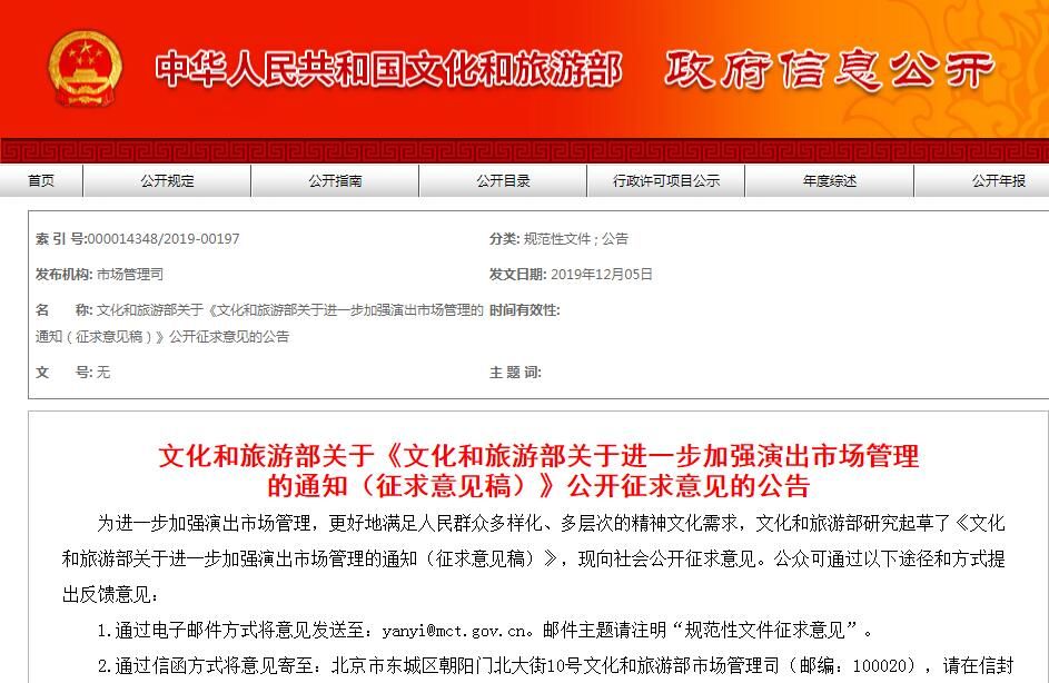 荔枝新闻讯 据文化和旅游部网站消息,为进一步加强演出市场管理,更好地满足人民群众多样化、多层次的精神文化需求,文化和旅游部研究起草了《文化和旅游部关于进一步加强演出市场管理的通知(征求意见稿)》,现向社会公开征求意见。公众可通过以下途径和方式提出反馈意见: