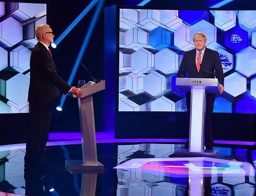 12月6日,在英国肯特,英国首相、保守党领导人鲍里斯·约翰逊(右)与工党领导人科尔宾参加电视辩论。 新华社发