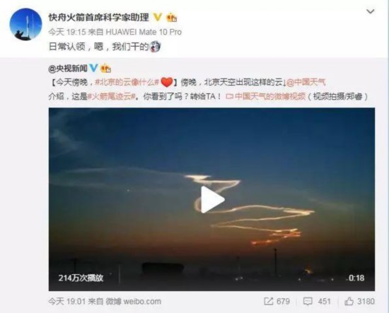 随后,航天科工火箭技术有限公司技术经理出来“认领”了这片航迹云:日常认领,我们干的!