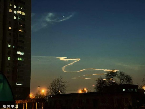 这到底是一朵什么云?中国天气网解释到,这是火箭升空后留下的航迹云,其尾迹被太阳余晖照亮,在延时摄影画面中,呈现出“龙状”。由于高度极高,河北、北京也能看到。