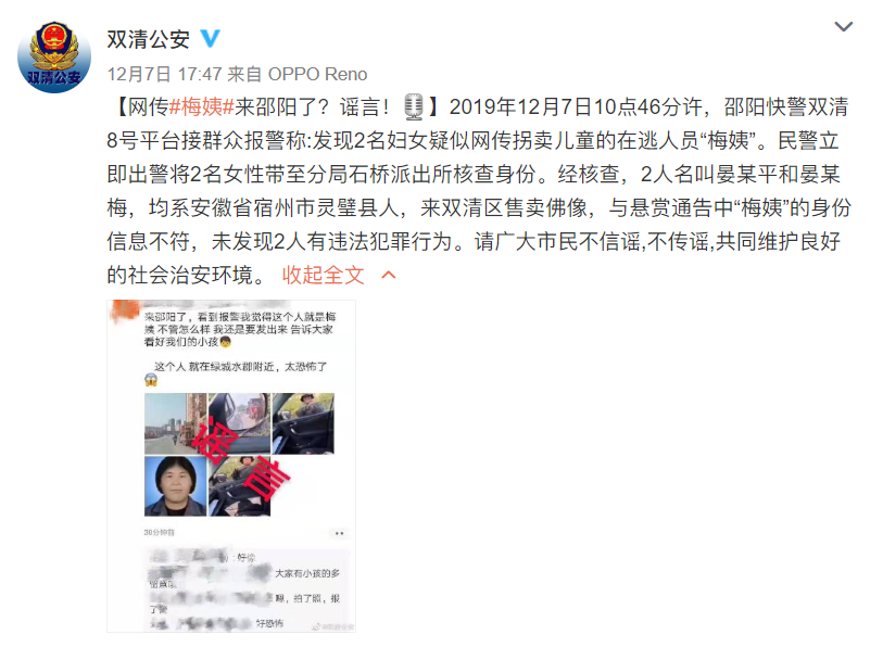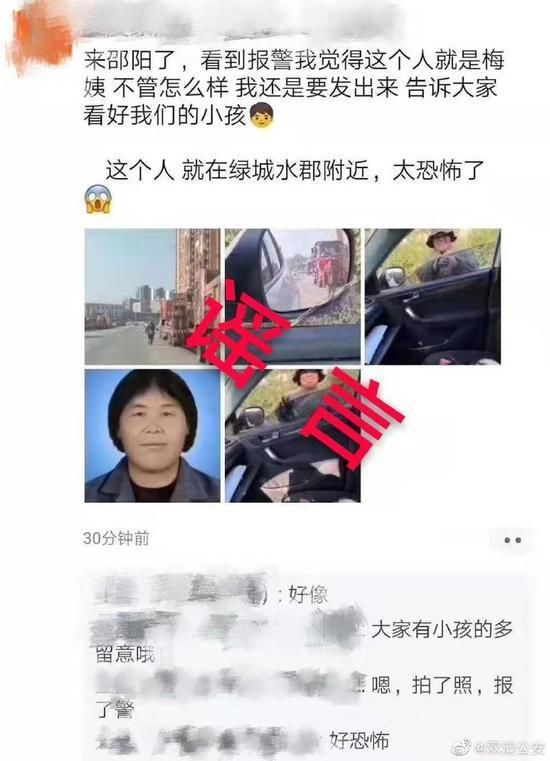 荔枝新闻讯 据双清公安微博消息,2019年12月7日10点46分许,邵阳快警双清8号平台接群众报警称:发现2名妇女疑似网传拐卖儿童的在逃人员“梅姨”。民警立即出警将2名女性带至分局石桥派出所核查身份。经核查,2人名叫晏某平和晏某梅,均系安徽省宿州市灵璧县人,来双清区售卖佛像,与悬赏通告中“梅姨”的身份信息不符,未发现2人有违法犯罪行为。请广大市民不信谣,不传谣,共同维护良好的社会治安环境。