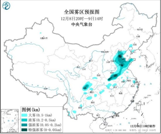中新网12月8日电 据中央气象台网站消息,中央气象台12月8日18时继续发布大雾黄色预警:预计8日夜间至9日上午,北京东部、天津、河北中南部、河南东部、山东、安徽北部、江苏西北部、湖北中部、湖南西北部、四川盆地中西部、贵州北部等地有大雾,其中,河北东部、河南东南部、山东西北部、四川盆地西部等地的部分地区有能见度不足200米的强浓雾,局地有能见度不足50米的特强浓雾。