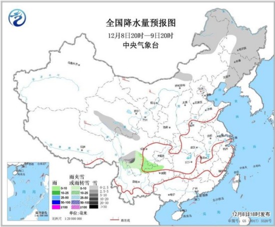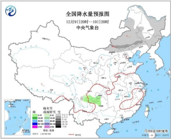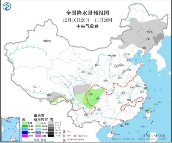 图2 全国降水量预报图(12月8日20时-9日20时)