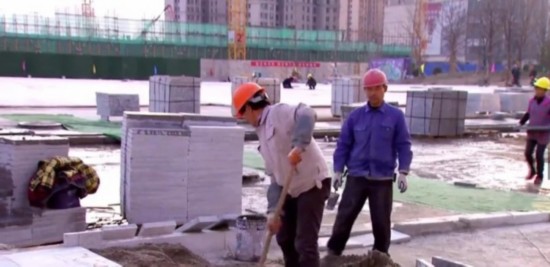 12月6日,在泰州永定路广场项目现场看到,工人正在抢抓工期进行石材铺装。