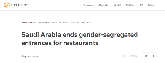 ABC将上述新规形容为“取消餐馆种族隔离的决定”。路透社也提到,过去一年,随着沙特餐厅、 咖啡馆、会议中心和音乐厅不再严格执行种族隔离政策,种族隔离现象已悄然减少。
