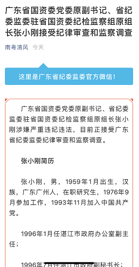 荔枝新闻讯 据广东省纪委监委消息:广东省国资委党委原副书记、省纪委监委驻省国资委纪检监察组原组长张小刚涉嫌严重违纪违法,目前正接受广东省纪委监委纪律审查和监察调查。