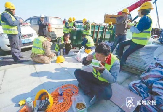 综合客运枢纽的工人们起早贪黑忙碌着,午饭就在工地解决。