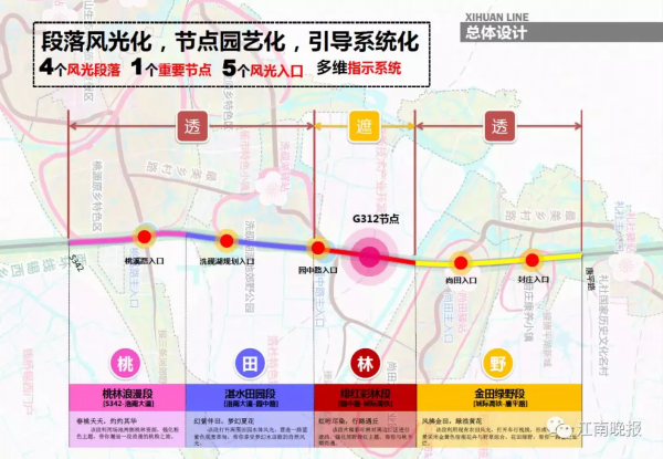 交通部门以“绣花”的精神,给道路的每一个角落增加彩化效果。本次西环线景观提升工程将打造桃溪路入口、洗砚湖规划入口、园中路入口、尚田入口与封庄入口5个风光入口,以及G312交叉口节点。