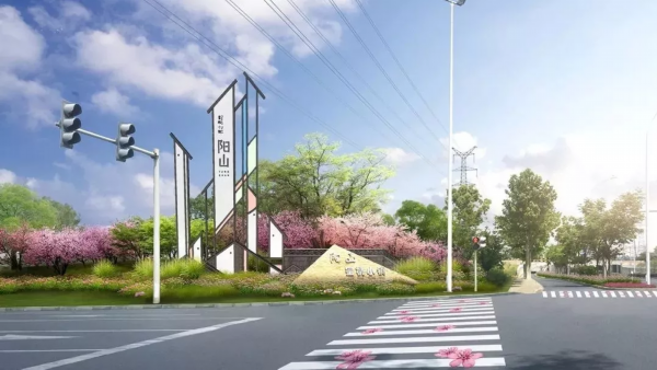 从效果图上看,每个入口都有相应的主题雕塑和园艺小品,比如阳山桃溪路入口,映入眼帘的是一处牌坊雕塑,上书“阳山蜜桃小镇”字样,透过牌坊可以看到背后的桃林,远景和近景相得益彰。
