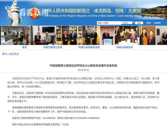 中国驻新西兰使馆已经启动怀特岛火山喷发应急机制,同时提醒在新游客和留学生近期灾害频发,要注意安全。