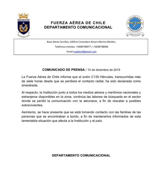【环球时报-环球网报道 记者 白云怡 侯佳欣】智利军方一架C-130运输机当地时间9日下午在飞往南极途中突然失踪。刚刚,智利空军在推特发布最新声明宣布,C-130已失去雷达联系7小时,被宣布失事。