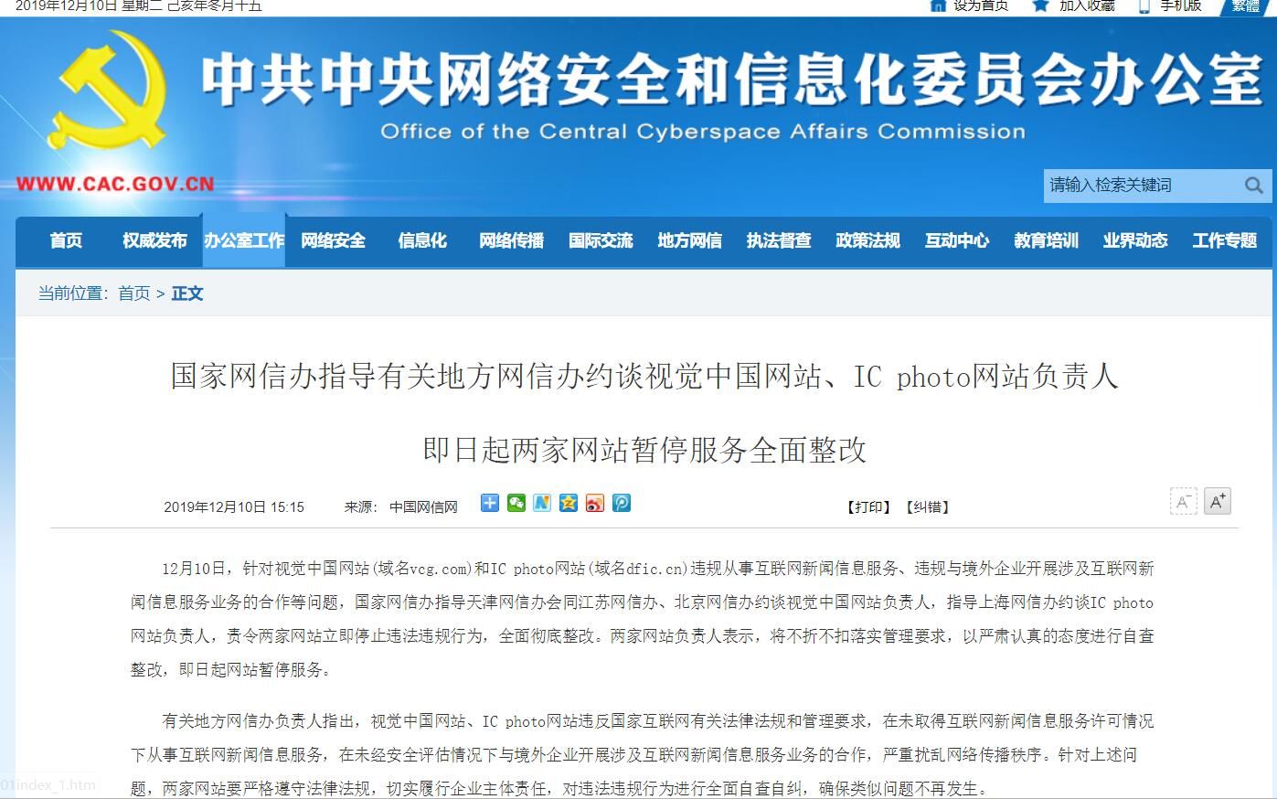 荔枝新闻讯 据国家网信办官网消息,12月10日,针对视觉中国网站(域名vcg.com)和IC photo网站(域名dfic.cn)违规从事互联网新闻信息服务、违规与境外企业开展涉及互联网新闻信息服务业务的合作等问题,国家网信办指导天津网信办会同江苏网信办、北京网信办约谈视觉中国网站负责人,指导上海网信办约谈IC photo网站负责人,责令两家网站立即停止违法违规行为,全面彻底整改。两家网站负责人表示,将不折不扣落实管理要求,以严肃认真的态度进行自查整改,即日起网站暂停服务。