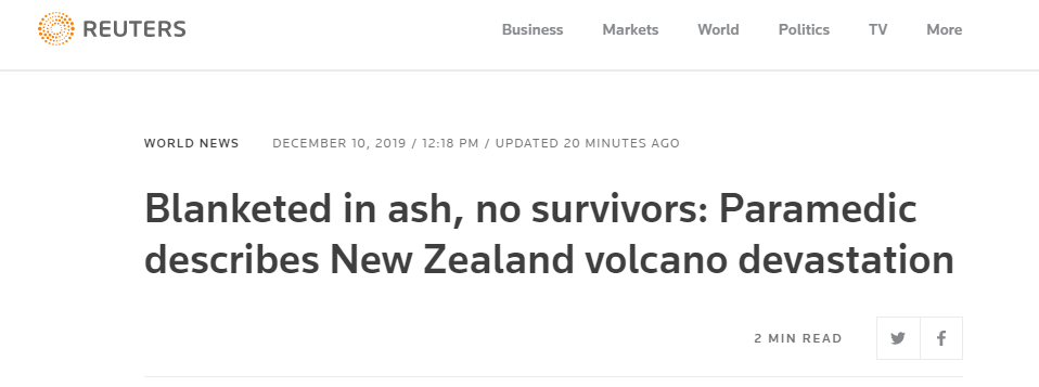 当地时间12月9日,位于新西兰普伦蒂湾怀特岛的一座火山突然喷发,造成至少5人死亡,8人下落不明。据路透社报道,当地时间12月10日,一名飞往怀特岛参与救援的医护人员向媒体介绍了他所见到的场景。他将自己在怀特岛上的所见所闻称之为“令人震惊的经历”,他还把怀特岛火山喷发与电视剧《切尔诺贝利》中的景象相提并论。