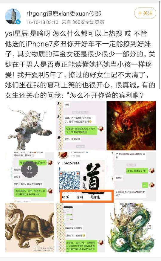 12月9日,一政务微博多次发布“测算 合婚 开财运”的宣传图在网上传播。该微博为政务蓝V,认证为“中共镇原县委宣传部官方微博”。
