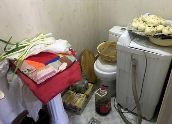 10月22日,在元山子村的陈福胜家,房屋角落安装了一个简易的厕所隔间。可推开门,里面堆放着褥子、包子、大葱等各种杂物和食物,马桶上还放着一个饭盆。