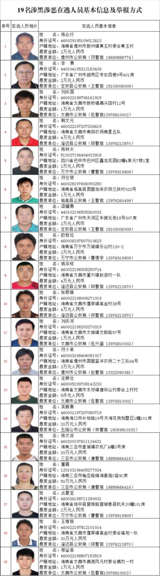 附19名涉黑涉恶在逃人员基本信息及举报方式