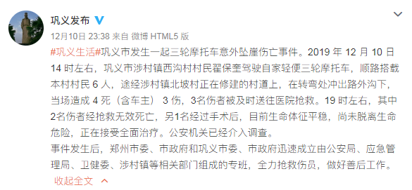 荔枝新闻讯 据巩义市政府新闻办官方微博消息,巩义市发生一起三轮摩托车意外坠崖伤亡事件。2019年12月10日14 时左右,巩义市涉村镇西沟村村民翟保奎驾驶自家轻便三轮摩托车,顺路搭载本村村民6人,途经涉村镇北坡村正在修建的村道上,在转弯处冲出路外沟下,当场造成4死(含车主)3伤,3名伤者被及时送往医院抢救。19时左右,其中2名伤者经抢救无效死亡,另1名经过手术后,目前生命体征平稳,尚未脱离生命危险,正在接受全面治疗。公安机关已经介入调查。