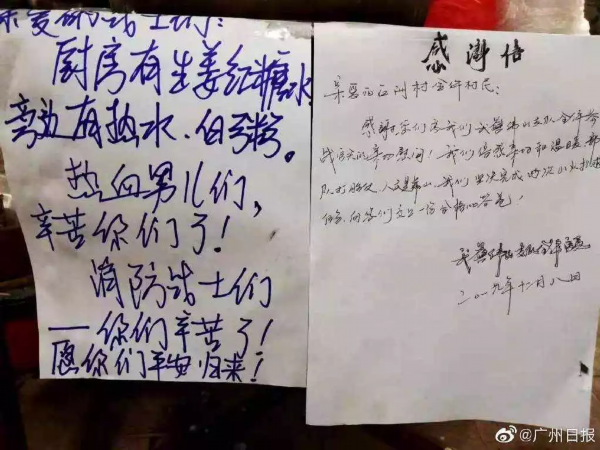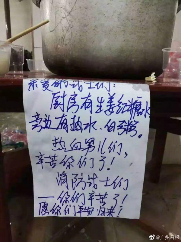 而在一间平房里,武警官兵们看到了一张纸条:“亲爱的战士们,厨房有生姜红糖水,旁边有热水、白粥,热血男儿们,辛苦你们了!消防战士们,辛苦你们了!愿你们平安归来!”