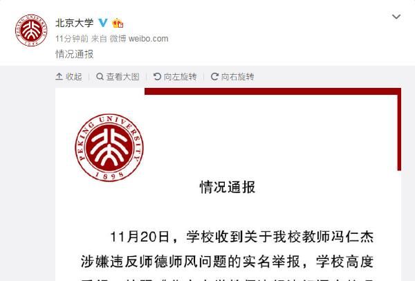 此前据媒体报道,北京大学一助理教授、博士生导师被举报与多名女子保持不正当关系,该事件在网络迅速发酵,北大校方介入调查。举报人自称是涉事男子、北京国际数学研究中心助理教授冯某杰的恋人,她称,希望其他女孩能认清楚这种人的危害,希望冯某杰向包括她在内的被骗女性道歉。