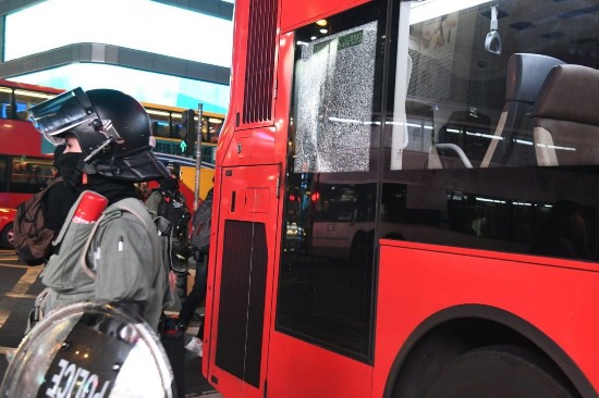 海外网12月12日电 昨日(11日)晚,香港多起巴士遭暴徒恶意破坏。香港警方表现勇毅,在行动中拘捕2男1女,一名香港警察在行动中受伤。