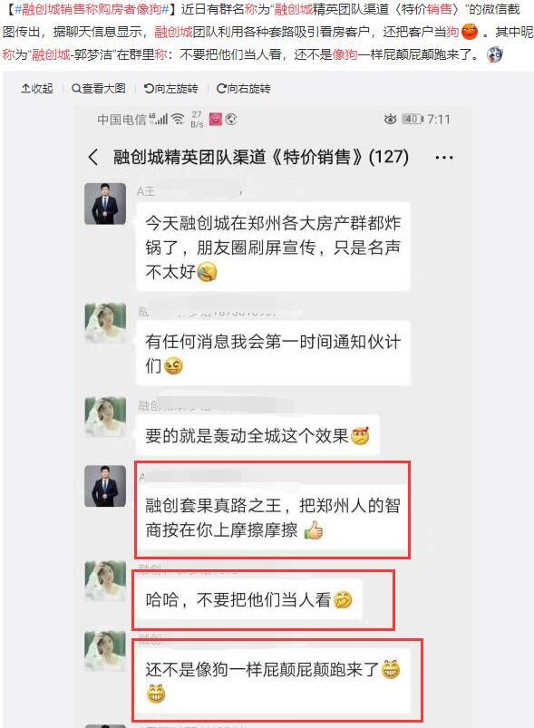 稍后,融创城楼盘销售群一名“置业顾问”在群内说购房者是狗引热议。他表示,“不要把他们当人看”、“像狗一样屁颠屁颠跑来了”、“自古套路得人心”,还有人称“融创套果真路之王,把郑州人的智商按在你(地)上摩擦摩擦”。此言论引发网友不满。