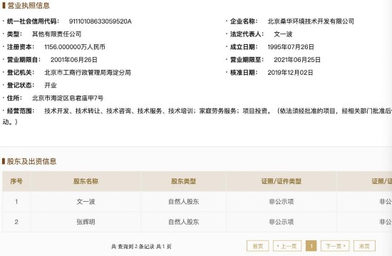 新京报记者获悉,北京桑华环境技术开发有限公司(以下简称“桑华环境”)出现股权变更,文一波的持股比例从22.15%大幅提升至70%,认缴出资额从256万元提升至809.2万元,而张辉明的持股比例则从77.85%大幅下降至30%,认缴出资额从900万元下降至346.8万元。