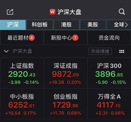 截至11:30,沪指报2920.43点,跌幅0.14%,成交量917.46亿元;深成指报9872.09点,涨幅0.2%,成交量1610.55亿元;创业板指报1729.96点,涨幅0.68%。