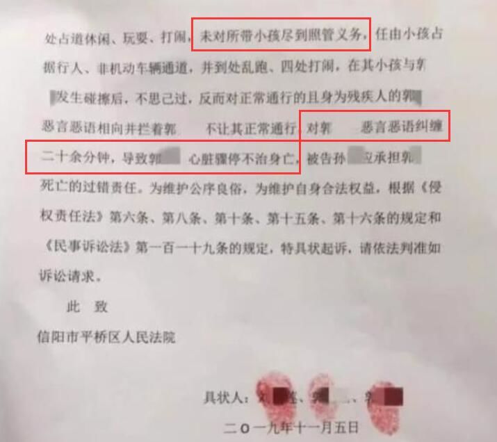 孙女士描述的事情经过在老人家属的诉状中也得到了印证,但双方表述有一定出入。去世老人郭先生的家人在诉状中认为,是孙女士未对所带小孩尽到照顾义务,任由小孩子在路上乱跑才导致当天碰撞事故的发生;事故发生后,孙女士不思己过,反而和其女的玩伴对老人恶言恶语纠缠20分钟,继而导致老人心脏骤停。