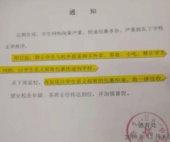新京报记者掌握的一份加盖“交口县一中德育处”公章的《通知》显示,近期发现,学生网购现象严重,快递包裹多杂,严重扰乱了学校正常秩序。即日起,禁止学生网购,以学生名义邮寄包裹快递到学校。从下周返校,再发现以学生名义邮寄的包裹快递,将一律没收。通知出具时间为“2019年12月8日。”该校一名工作人员对新京报记者称,通知已下发,“应该正在落实”。