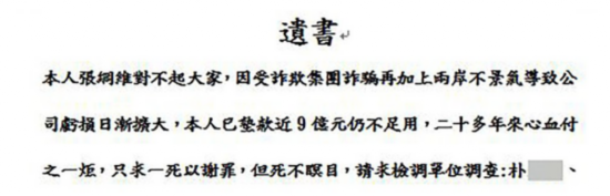 据台湾“联合新闻网”报道,张纲维被曝失联,留下的“遗书”内容如下:本人张纲维对不起大家,因受诈欺集团诈骗再加上两岸(关系)不景气导致公司亏损日渐扩大,本人已垫款近9亿元(台币)仍不足用,二十多年来心血付之一炬,只求一死以谢罪,但死不瞑目,请求检调单位调查:朴某、林某、陈某、王某四人,(他们)佯称有大笔资金将挹注公司,分文未进导致突然跳票,又收取高额作业费,使我雪上加霜,我一心希望远航能持续翱翔天际,最终听信四人话术,造成现在这种情况,希望他们能出面履约解决所有债务,远航能重生,公司也会做破产清算希望解决所有人问题 ,想不到12年前凭一己之力独资救了远航,没想到竟被拖累如此下场,悔恨至死,都是我的错,不关其他人的事。