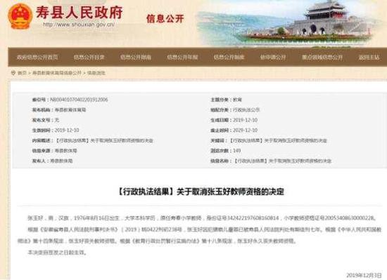 日前,张玉好教师资格遭取消,消息公布在安徽寿县政府网站,发布机构为寿县教育体育局。