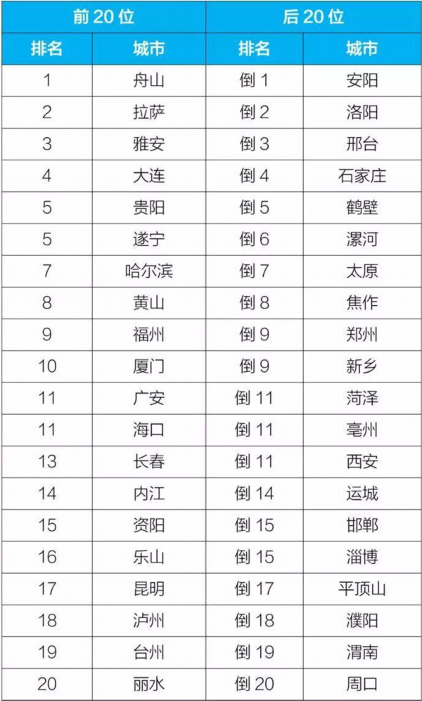2019年11月,168个重点城市中安阳、洛阳、邢台市等城市空气质量相对较差;舟山、拉萨、雅安市等城市空气质量相对较好。